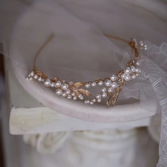 繊細なリーフモチーフと上品なパールを組み合わせた、華やかで優雅なブライダルティアラです。