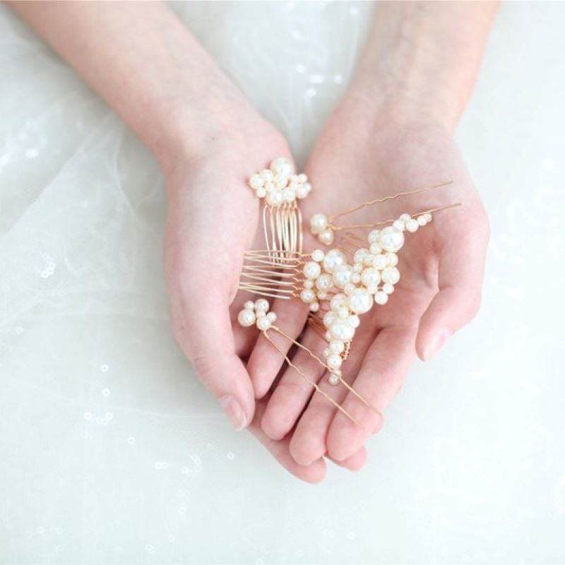 シンプルでエレガントな印象のパールヘアアクセサリー。