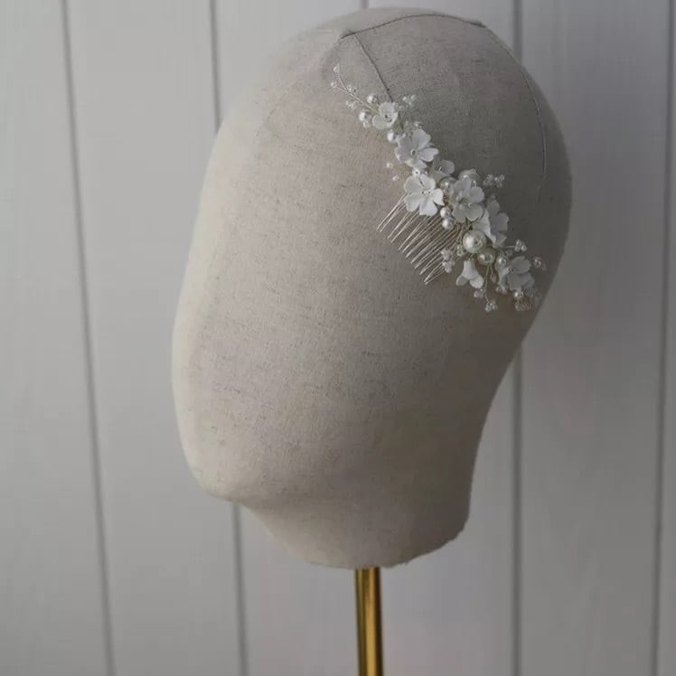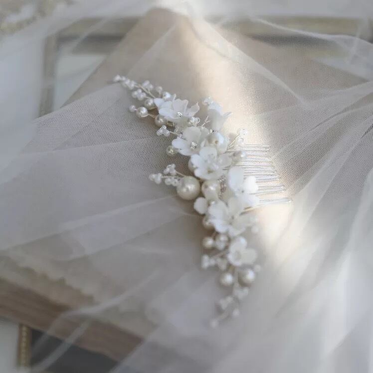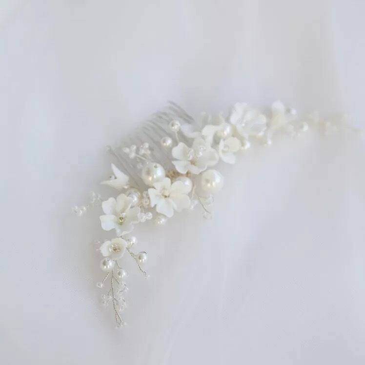 純白のフラワーで優しく清楚なイメージのヘアアクセサリー。