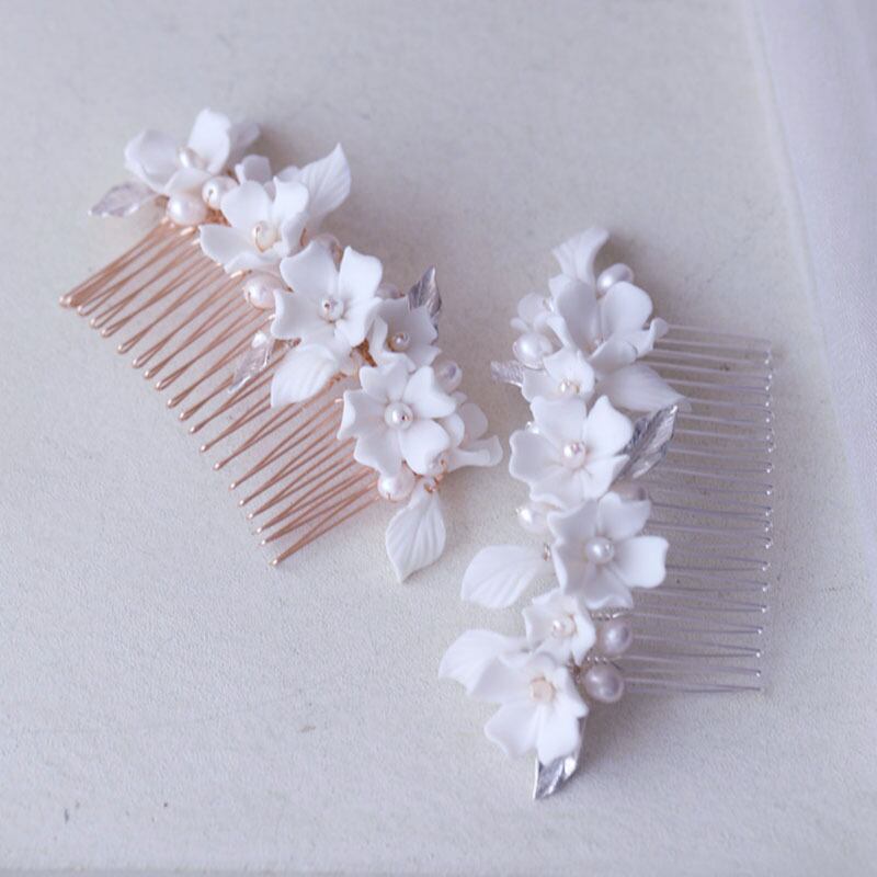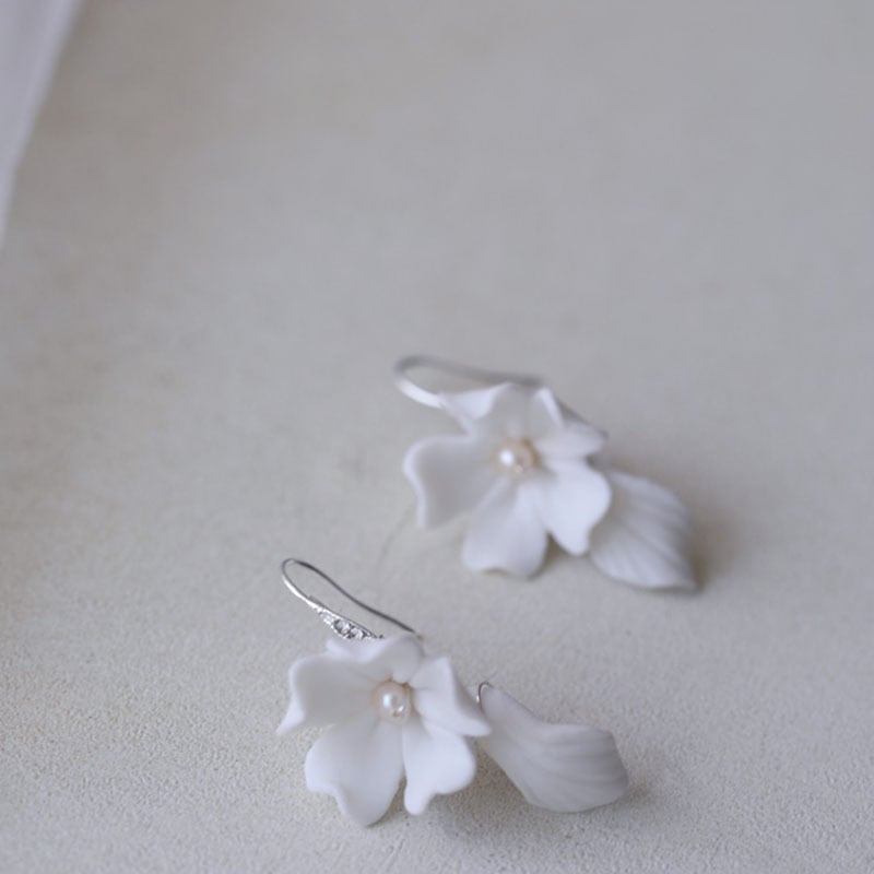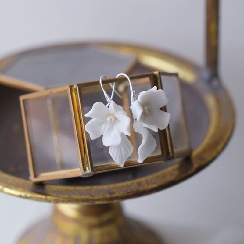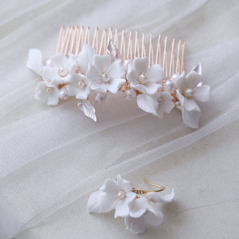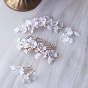 パールモチーフとクレイフラワーの上品な輝きを放つヘアアクセサリーとピアス。