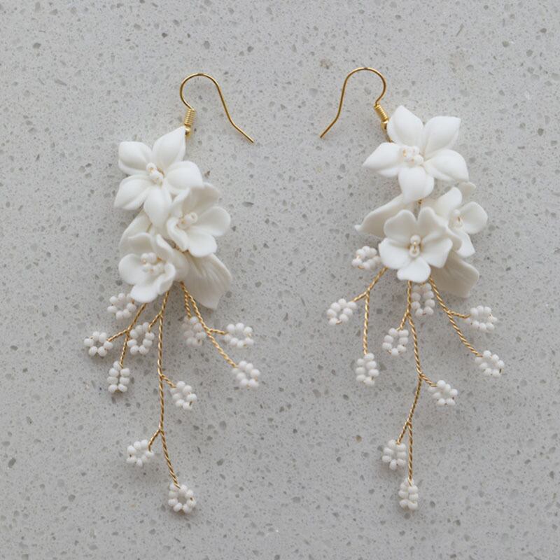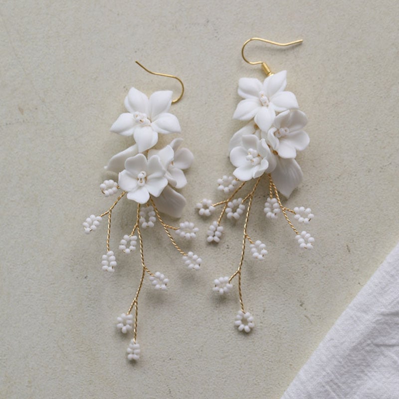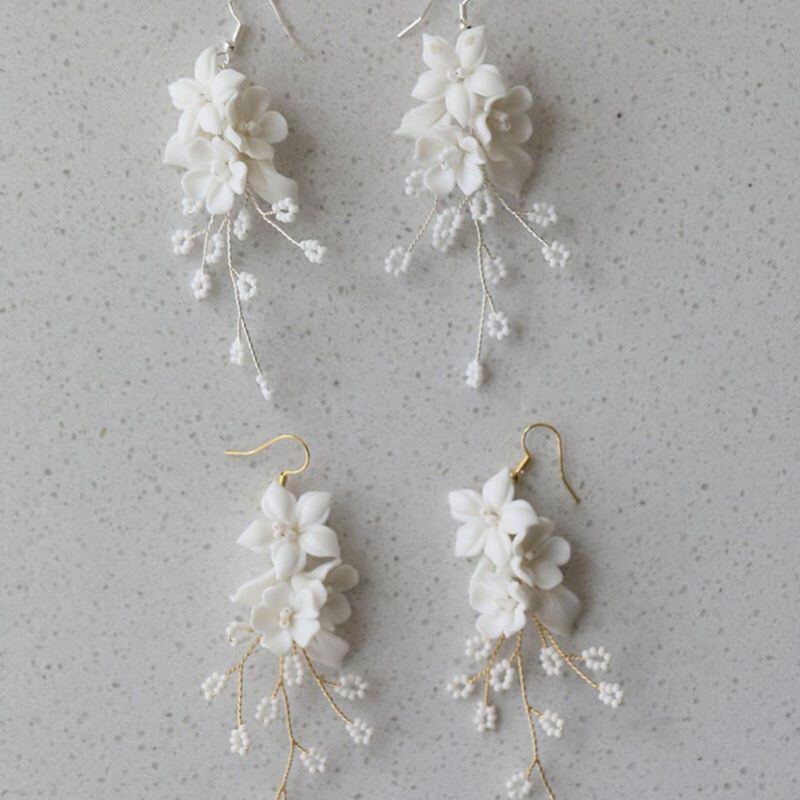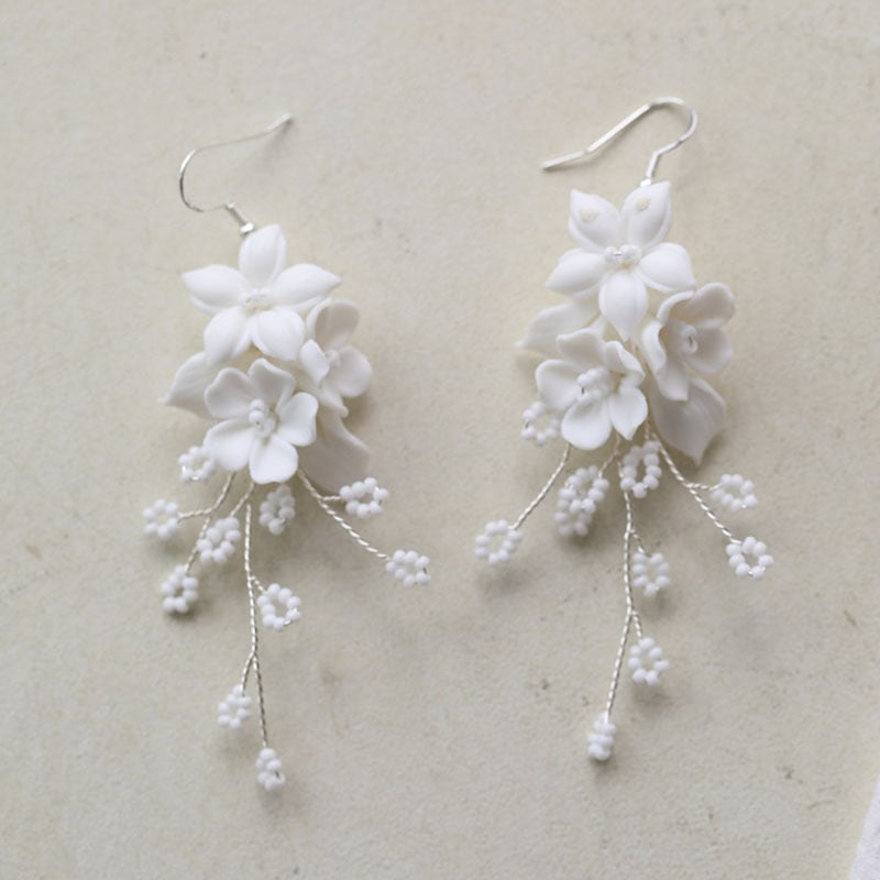 ホワイトフラワーとビーズと小枝のピアス/イヤリング